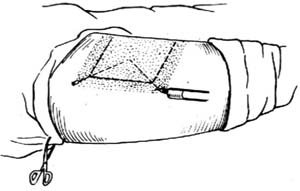 3.包扎固定 供皮区创面缝合呈>-<形,分别用凡士林油纱布置于皮管和供皮区上,油纱布间置纱布垫,皮管两侧分别置两个较皮管略粗的纱布卷保护皮管不致受压,然后包扎[图5]。