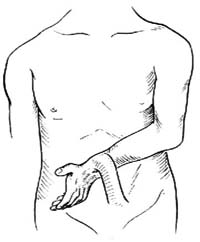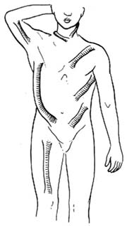 管状皮瓣是将一块双蒂的皮瓣向内卷成管状,长、宽比例一般是3∶1;因做到完全没有创面,故亦称为闭合性皮瓣。这种皮瓣可以转移到较远的部位,扩大了皮瓣移植应用的范围。缺点是手术次数多,花费的时间长。游离皮瓣问世后,皮管的使用已大大减少。在确定缺损部位不能用扁平皮瓣修复,也不宜采用游离皮瓣移植时,可用皮管修复。再设计皮管长度、宽度、部位和转移方法。根据皮管采用部位,分为腹部皮管、胸腹皮管、肩胸皮管、上臂皮管和颈部皮管等[图1]。 1-1 切口 图1 椎管-脊髓探查术 图2 皮管的定点、划线 图3 皮管的切开、分离 ⑴卷成皮管 ⑵两端褥式缝合或植皮 图4 皮管的形成 图5 皮管形成后的包扎固定 图6 一次直接转移腹部皮管修复上肢 ⑴胸腹皮管先转移至手腕 ⑵手腕携带皮管再转移至颈部 图7 手腕携带转移皮管 图8 取皮区的局部浸润麻醉