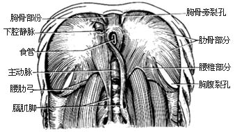 膈肌是由起源于胸腔底部四周的几组肌肉和筋膜组成的。每侧的肌肉组织分三部分,即胸骨部分、肋骨部分和腰椎部分(包括膈肌脚),汇合于中心腱[图1]。各部分肌肉紧密相连,被胸、腹膜覆盖。这三部分肌肉相连的部位,往往由于发育不正常而形成缺损或弱点,成为先天性膈疝的解剖基础。胸骨部与肋骨部之间的缺损或弱点叫做胸骨旁裂孔[图2],经此孔的膈疝,临床上称之为胸骨后膈疝。肋骨部与腰椎之间的缺损或弱点叫做胸腹膜裂孔[图3],经此孔的膈疝,在先天性膈疝中较为多见,临床上称为胸腹裂孔疝。