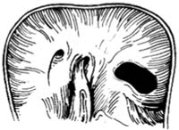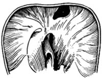 部分膈肌发育不全或缺损[图4],及其胸腹膜未完全闭合,遗留大小不等的缺损,多发生在左侧,导致胃、结肠或脾经此疝入胸腔,称先天性膈疝。膈肌发育正常,但由于胸腹部闭合性损伤或开放性损伤,造成膈肌破裂,可引起损伤性膈疝。