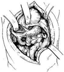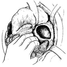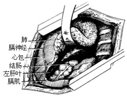 1.体位、切口 右侧卧位,左手外侧切口,成人经第8肋床入胸,儿童经第8肋间进胸。