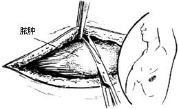 2.切口 以脓肿为中心,沿肋骨走向作皮肤切口。如有窦道或局部皮肤被累及,可作梭形切口,切除窦道和累及皮肤。