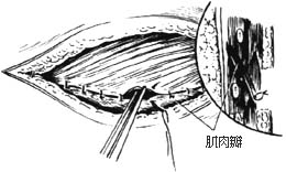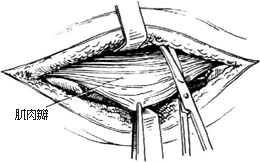 5.缝合切口 用生理盐水冲洗局部,将链霉素粉撒于残腔内,根据残腔大小,再将附近肌肉分离成瓣,转移充填空腔,用细肠线将肌瓣缝合固定在腔底,最后缝合皮肤。术前有窦道者,宜放胶皮片引流。切口加压包扎[图1-6、7]。