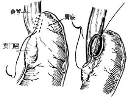 1.食管胃侧侧吻合术 适用于食管下段及贲门癌。适当分离胃底和部分胃大弯,将胃底上提到肿瘤以上3~5cm处以备与食管行侧侧吻合。在预定的吻合部分,将胃底的浆肌层与食管的肌层沿长轴作3~4针褥式缝合。用一肠钳夹住胃体后,在第1排缝线前方约1cm处的胃壁,作一与缝线排列平行的纵切口,约3cm长,切开胃壁,钳夹、缝扎粘膜下出血点;瑞在食管壁亦作一与胃壁切口大小相称的切口[图1]。以后,在后壁和前壁的内层各作全层间断或连续缝合。最后,在前壁浆肌层加作几针间断褥式缝合。如果癌已累及胃底部并固定于腹后壁,上述吻合术将无法施行。