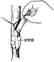 (2)另一种是开胸置管。切开肿瘤上方的食管,用子宫颈扩张器扩张肿瘤狭窄部后,放入适合的塑料管。然后,缝合食管切口,再将导管的上端采用缝合或结扎法固定于食管上,以防导管上移[图4]。