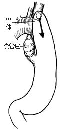 对食管中段癌,应将胃大、小弯较广泛分离,并切断胃左动脉,分离食管下段,然后将胃上提,在主动脉弓上面与食管作侧侧吻合[图2]。