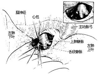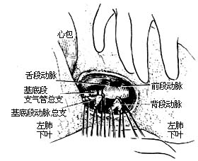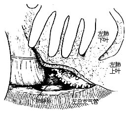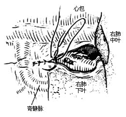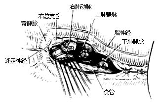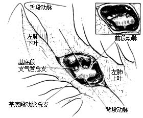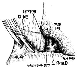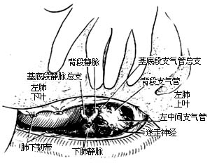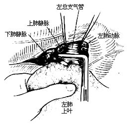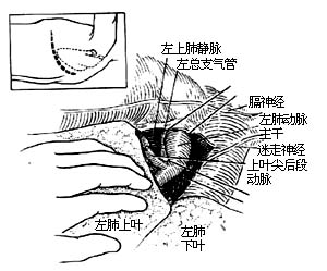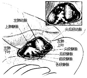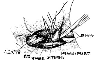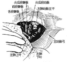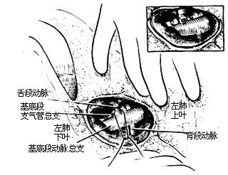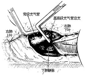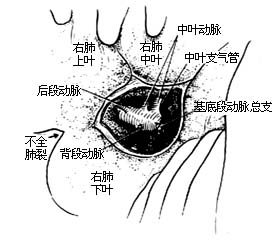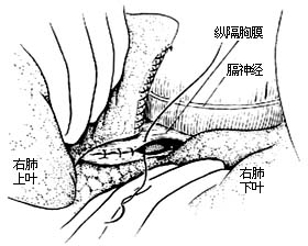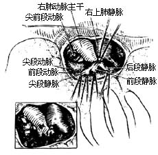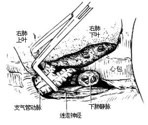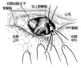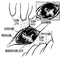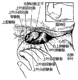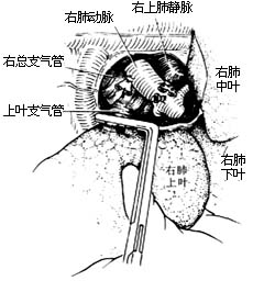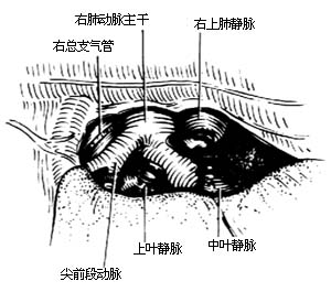 在完全分离胸膜粘连后,将肺门前、后及上缘的纵隔胸膜全部剪开,将肺向下后方牵引,在肺门上方可以见到迷走神经分向肺门的神经丛及伴随的小血管,应予全部切断、结扎。再分离奇静脉与上腔静脉汇合处下方的纵隔结缔组织,即能显露右肺动脉主干及及其上叶尖前段动脉分支。右肺动脉下段的前面被右上肺静脉覆盖。