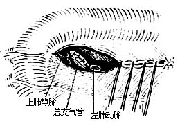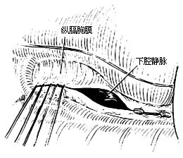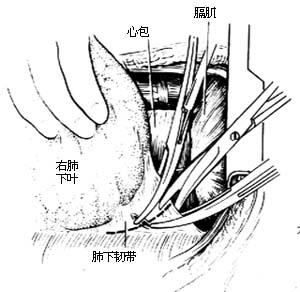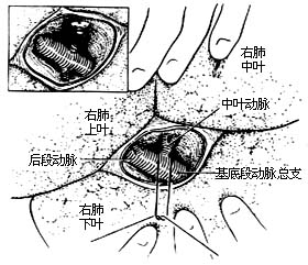 4-1 在斜裂和水平裂交界处切开胸膜,显露、结扎、切断右中叶动脉