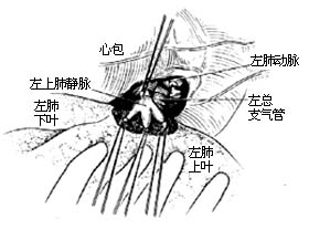 右肺动脉主干较短,须分别将右上叶尖前段动脉和右肺动脉主干(包括主干下段)作鞘膜分离、结扎加缝扎后切断,使肺动脉有一较长的残端,结扎线不易滑脱[图1-3]。