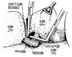 分离胸膜粘连及不全肺裂。在斜裂与水平裂交界处,将上叶向上牵引,中、下叶向下牵引。切开叶间胸膜,找到肺动脉主干。在上叶后段动脉以下的前侧,可发现中叶动脉分出1支或2支进入中叶。这一动脉一般和下叶背段动脉在同一平面,少数则在下叶背段动脉以下才分出。分离完成后即可结扎、缝扎和切断[图4-1]。在肺门前侧分离上肺静脉中叶支,将其结扎、缝扎和切断[图4-2]。中叶支气管位于动脉后侧,从右侧中间支气管几前分出,较易显露,予以分离、轻夹、吹胀证实后,即可切断、缝合[图4-3]。方法与右上肺叶切除术相同。支气管残端可用上、下叶间胸膜覆盖[图4-4]。