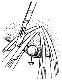 局限于肺脏表浅部位的良性较小病变,可以不考虑肺段分布,直接用两把大止血钳作楔形钳夹后切除[图9-1]。切面分别作双重连续细丝线缝合,第1层绕过止血钳缝合,取出止血钳后收紧缝线[图9-2],然后再用原线返回缝合到头,将两个线头互相结扎[图9-3]。
