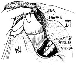 8-4 吹胀健肺,显露肺段分界线后挤开段间隙,结扎段面上支气管,摘除病肺,显露段间静脉