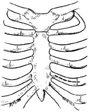 2.切口 沿左第5肋软骨作5cm横切口,切除肋软骨约4cm,自肋床进入心前区。若有胸膜覆盖,应将其向左推开[图1-1]。