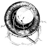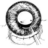 在某些情况下,用调位钩将晶体上袢旋转到位,简单易行,可作为囊镊送入法的补充。即以调位钩插入调位孔,以推旋动作,使晶体作顺时针旋转,晶体上袢将在瞳孔张力限制下被压缩,其膝部一旦越过瞳孔缘,将自行弹向睫状沟(图3)。