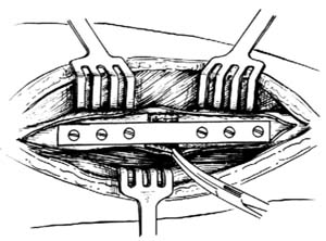 ⑵置放对侧骨板,用长螺钉将两侧骨板和接受骨固定在一起