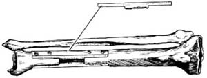 3.内固定作用 硬的皮质骨可以修成板状,或修成柱状插入病骨两端。用螺钉固定,除有上述两种作用外,还可以起到一定的内固定作用,以保持骨折(或病骨)端的对位,为骨折的愈合创造有利条件。